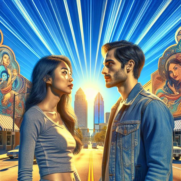 ChatGPT: Prompt: Generate an image in the style of a meme showing a couple in Decatur, Alabama, standing on a vibrant street on a clear, sunny day. Both individuals have a surprised expression as they look at each other, with the city skyline and clear blue sky in the background. The image should convey the newfound clarity and realization within their relationship, without using any words or speech bubbles.