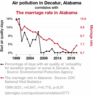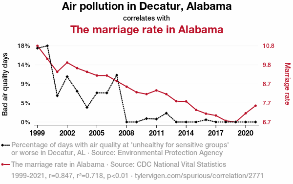 - The spurious research paper: Clearing the Air: An Analysis of the Relationship Between Air Pollution in Decatur, Alabama and the Marriage Rate in Alabama