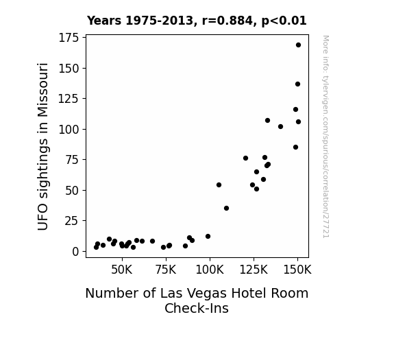 This means 78.1% of the change in the one variable (i.e., Number of Las Vegas Hotel Room Check-Ins) is predictable based on the change in the other (i.e., UFO sightings in Missouri) over the 39 years from 1975 through 2013.
