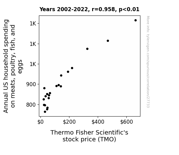 This means 91.8% of the change in the one variable (i.e., Thermo Fisher Scientific's stock price (TMO)) is predictable based on the change in the other (i.e., Annual US household spending on meats, poultry, fish, and eggs) over the 21 years from 2002 through 2022.