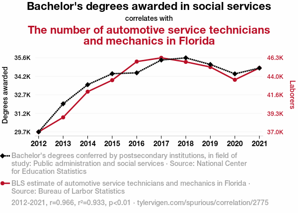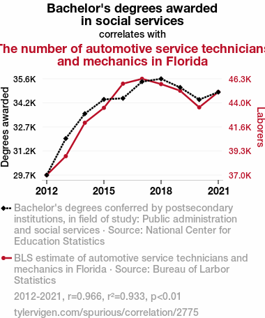 This means 93.3% of the change in the one variable (i.e., The number of automotive service technicians and mechanics in Florida) is predictable based on the change in the other (i.e., Bachelor's degrees awarded in social services) over the 10 years from 2012 through 2021.