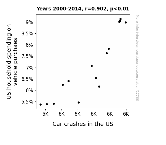 This means 81.4% of the change in the one variable (i.e., Car crashes in the US) is predictable based on the change in the other (i.e., US household spending on vehicle purchaes) over the 15 years from 2000 through 2014.