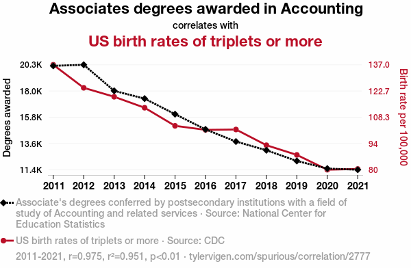 This means 95.1% of the change in the one variable (i.e., US birth rates of triplets or more) is predictable based on the change in the other (i.e., Associates degrees awarded in Accounting) over the 11 years from 2011 through 2021.