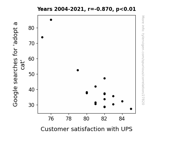 This means 75.6% of the change in the one variable (i.e., Customer satisfaction with UPS) is predictable based on the change in the other (i.e., Google searches for 'adopt a cat') over the 18 years from 2004 through 2021.