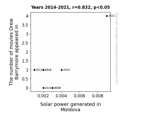 This means 69.2% of the change in the one variable (i.e., Solar power generated in Moldova) is predictable based on the change in the other (i.e., The number of movies Drew Barrymore appeared in) over the 8 years from 2014 through 2021.