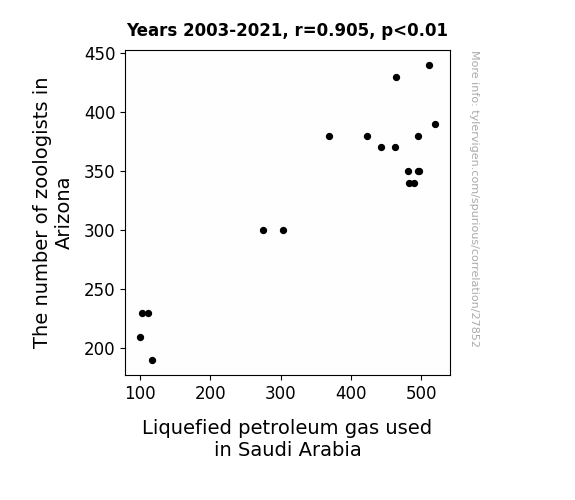 This means 81.8% of the change in the one variable (i.e., Liquefied petroleum gas used in Saudi Arabia) is predictable based on the change in the other (i.e., The number of zoologists in Arizona) over the 19 years from 2003 through 2021.