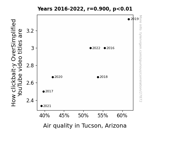 This means 81.1% of the change in the one variable (i.e., Air quality in Tucson, Arizona) is predictable based on the change in the other (i.e., How clickbait-y OverSimplified YouTube video titles are) over the 7 years from 2016 through 2022.