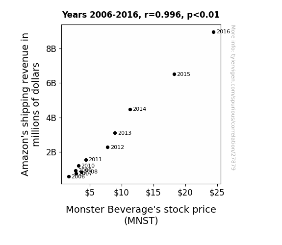This means 99.2% of the change in the one variable (i.e., Monster Beverage's stock price (MNST)) is predictable based on the change in the other (i.e., Amazon's shipping revenue in millions of dollars) over the 11 years from 2006 through 2016.