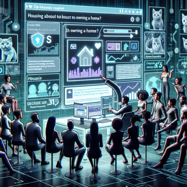 Prompt: [ Data cyber art ] Generate an image of a crowd of diverse people standing around a computer in a futuristic environment. They are visibly eager and engaged as they type "reddit" into the search bar on Google. The screen displays a trending post about the benefits of homeownership on Reddit, accompanied by a stock market graph showing Lennar's (LEN.B) stock price steadily rising in the background. A nearby bulletin board is covered with adorable cat memes, adding a lighthearted and positive vibe to the economic discussion. The setting should exude a digital and cyber-inspired aesthetic, with a mix of futuristic and contemporary elements. The depiction should include only scenes, people, and objects, it should not include text or speech bubbles.