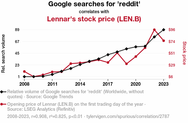 This study explores the peculiar relationship between Google searches for the online discussion forum 'Reddit' and the stock price of Lennar Corporation (LEN.B) on the New York Stock Exchange. Employing data from Google Trends and LSEG Analytics (Refinitiv), we meticulously examine the temporal dynamics of 'Reddit' search interest and Lennar's stock performance from 2008 to 2023. Our analysis reveals a strikingly high correlation coefficient of 0.9083421 and a statistically significant p-value of less than 0.01. This implies a strong positive association between the two variables, indicating a potential influence of online chatter on stock market movements.