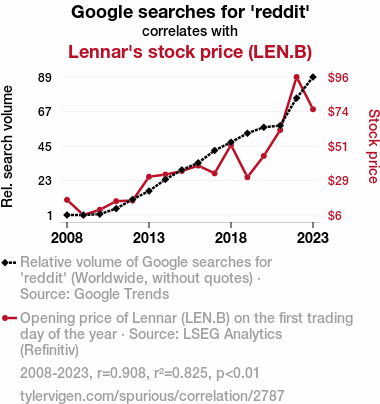 - The spurious research paper: Reddit-al Street: A Correlative Analysis of Google Searches for 'Reddit' and Lennar's Stock Price