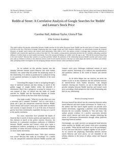 User prompt: Please provide potential search keywords for a paper titled Reddit-al Street: A Correlative Analysis of Google Searches for 'Reddit' and Lennar's Stock Price with an abstract of This study explores the peculiar relationship between Google searches for the online discussion forum 'Reddit' and the stock price of Lennar Corporation (LEN.B) on the New York Stock Exchange. Employing data from Google Trends and LSEG Analytics (Refinitiv), we meticulously examine the temporal dynamics of 'Reddit' search interest and Lennar's stock performance from 2008 to 2023. Our analysis reveals a strikingly high correlation coefficient of 0.9083421 and a statistically significant p-value of less than 0.01. This implies a strong positive association between the two variables, indicating a potential influence of online chatter on stock market movements.