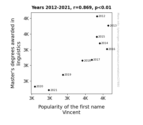 This means 75.6% of the change in the one variable (i.e., Popularity of the first name Vincent) is predictable based on the change in the other (i.e., Master's degrees awarded in linguistics) over the 10 years from 2012 through 2021.