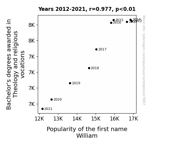 This means 95.4% of the change in the one variable (i.e., Popularity of the first name William) is predictable based on the change in the other (i.e., Bachelor's degrees awarded in Theology and religious vocations) over the 10 years from 2012 through 2021.