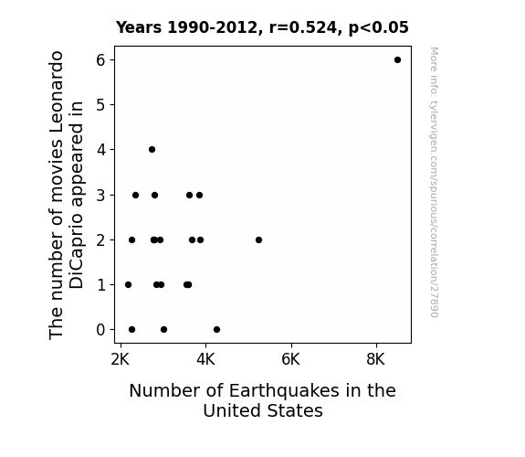 This means 27.4% of the change in the one variable (i.e., Number of Earthquakes in the United States) is predictable based on the change in the other (i.e., The number of movies Leonardo DiCaprio appeared in) over the 23 years from 1990 through 2012.