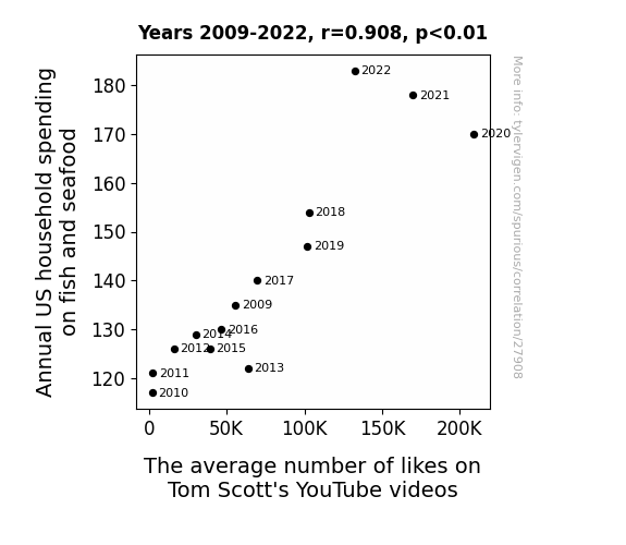 This means 82.4% of the change in the one variable (i.e., The average number of likes on Tom Scott's YouTube videos) is predictable based on the change in the other (i.e., Annual US household spending on fish and seafood) over the 14 years from 2009 through 2022.