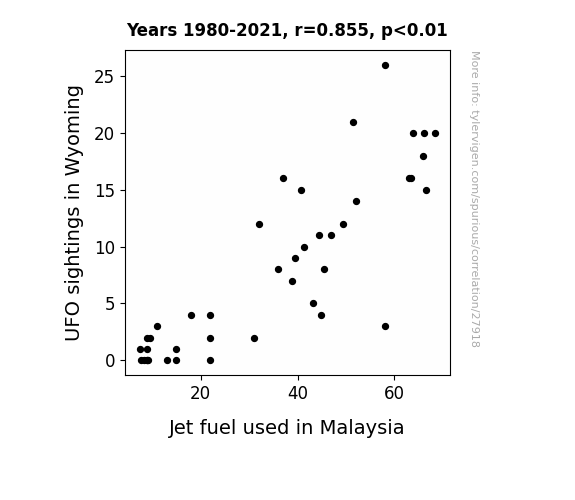 This means 73% of the change in the one variable (i.e., Jet fuel used in Malaysia) is predictable based on the change in the other (i.e., UFO sightings in Wyoming) over the 42 years from 1980 through 2021.