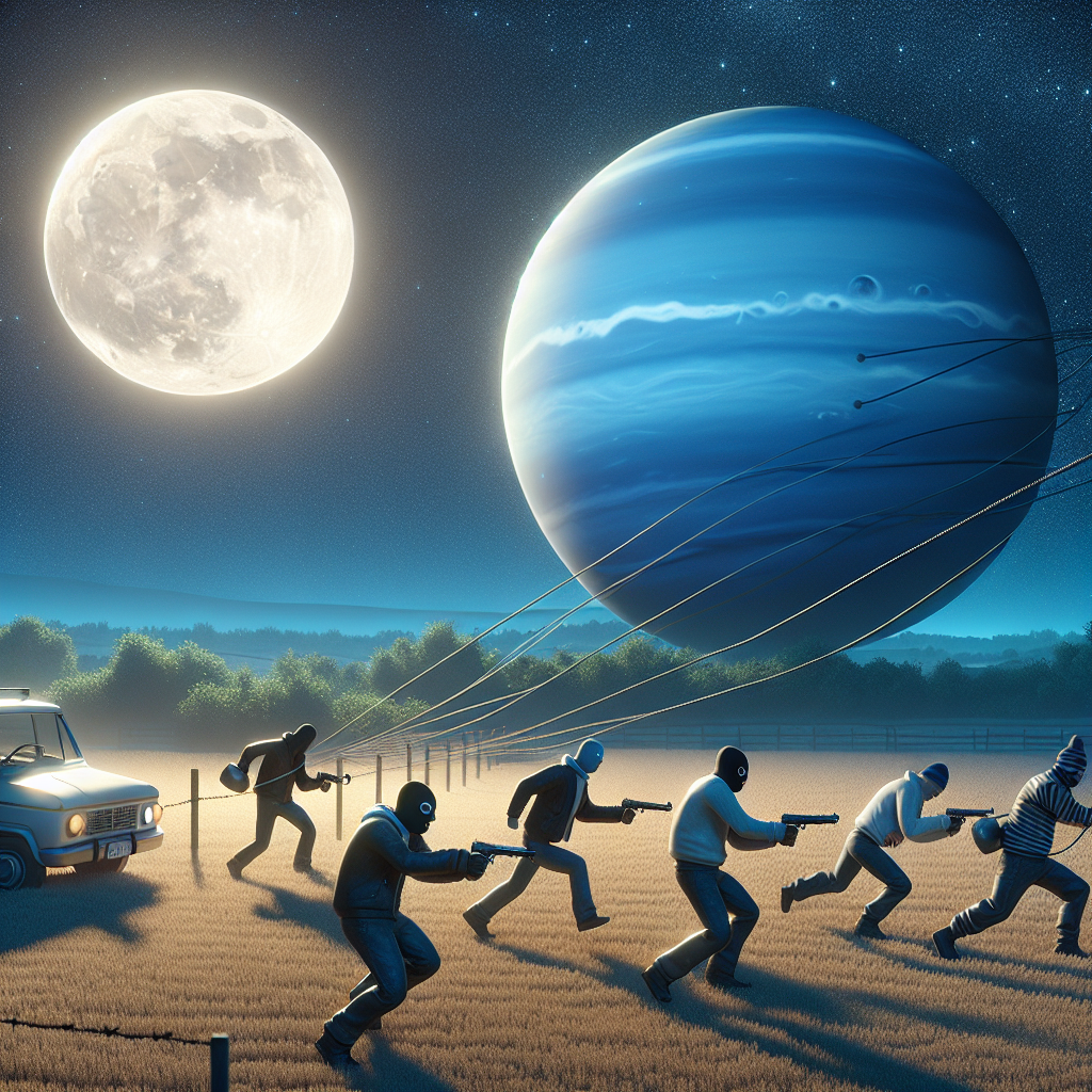 User prompt: Please describe a visual scene that prominently depicts both The distance between Neptune and the moon and Burglaries in Wyoming, in the following situation: Because as Neptune moved closer to the moon, it exerted a gravitational pull on all the potential burglars in Wyoming, making it physically harder for them to carry out their nefarious deeds. As a result, they decided it was just too much effort and stayed home watching Netflix instead.. Keep the description simple.