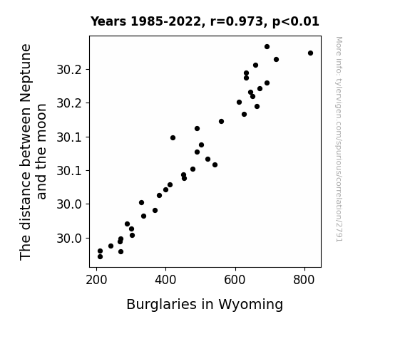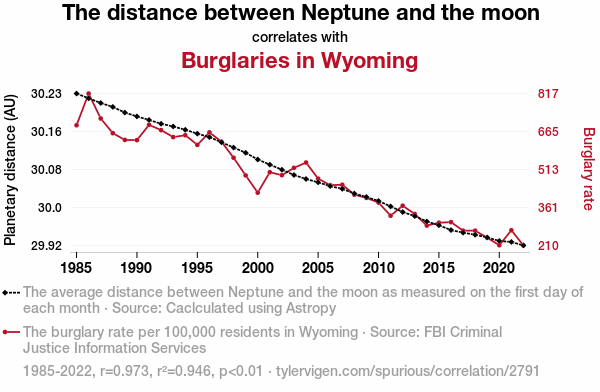 This means 94.6% of the change in the one variable (i.e., Burglaries in Wyoming) is predictable based on the change in the other (i.e., The distance between Neptune and the moon) over the 38 years from 1985 through 2022.