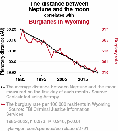 - The spurious research paper: Neptune's Tune and Wyoming's Crime Spree: The Lunar Distance Burglary Hypothesis