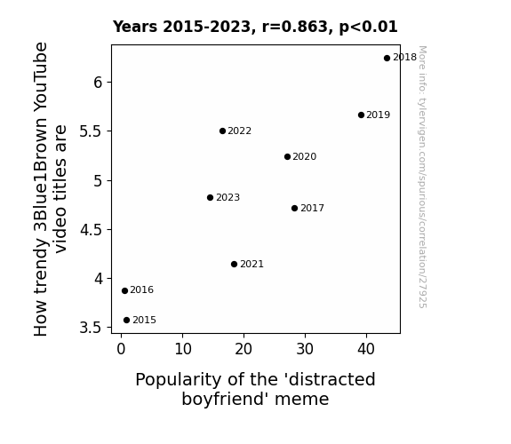 This means 74.4% of the change in the one variable (i.e., Popularity of the 'distracted boyfriend' meme) is predictable based on the change in the other (i.e., How trendy 3Blue1Brown YouTube video titles are) over the 9 years from 2015 through 2023.
