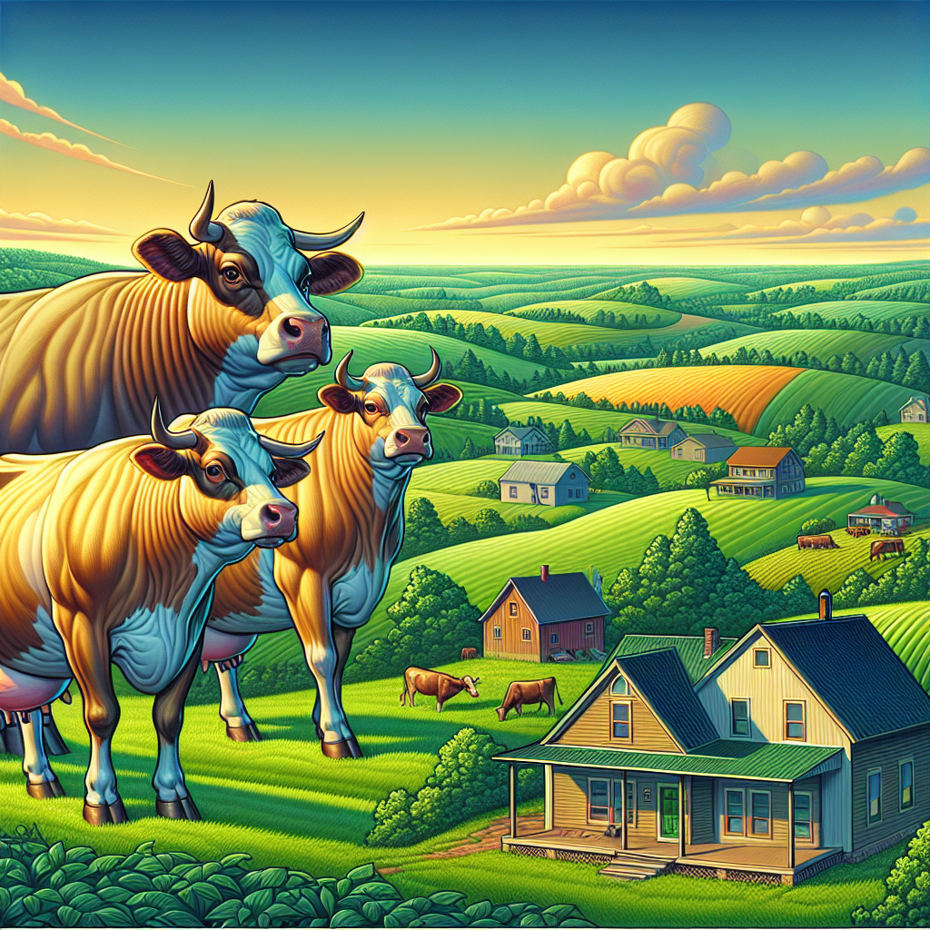 Prompt: Generate a whimsical illustration portraying the idyllic countryside of Michigan, where cows with strong, muscular bodies stand as guardians around quaint homes. The cows, with watchful eyes and a determined presence, exude a sense of protection and security for the community. The scene should emphasize the charming rural setting, featuring lush green pastures and quaint homes nestled among rolling hills. The cows, with a touch of whimsy, should be depicted in a friendly and approachable manner, blending their strength with a sense of warmth and security. The depiction should include only scenes, people, and objects, it should not include text or speech bubbles.