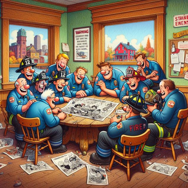 ChatGPT: [ Whimsical illustration ] Generate an image of a cozy and nostalgic fire station in a quaint Minnesota town. The scene showcases a group of friendly firefighters gathered around a worn wooden table, immersed in the pages of xkcd comics. The tabletop is strewn with comics, some of which are being held up for others to see, eliciting chuckles and grins. On one side of the room, a colorful bulletin board adorned with fire safety tips and cautionary notices about arson incidents in the state serves as a backdrop, adding a touch of seriousness to the lighthearted moment. The firefighters, with expressions of amusement and camaraderie, are engrossed in the humorous and heartwarming comics, enjoying a well-deserved break amidst the serene atmosphere of the fire station.