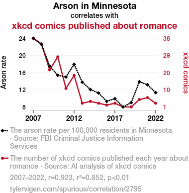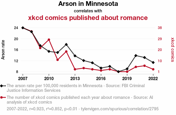 User prompt: Please make up a funny explanation for how a decrease in Arson in Minnesota caused xkcd comics published about romance to decrease. Add a funny one-liner at the end.