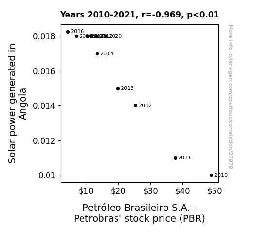 This means 93.8% of the change in the one variable (i.e., Petróleo Brasileiro S.A. - Petrobras' stock price (PBR)) is predictable based on the change in the other (i.e., Solar power generated in Angola) over the 12 years from 2010 through 2021.