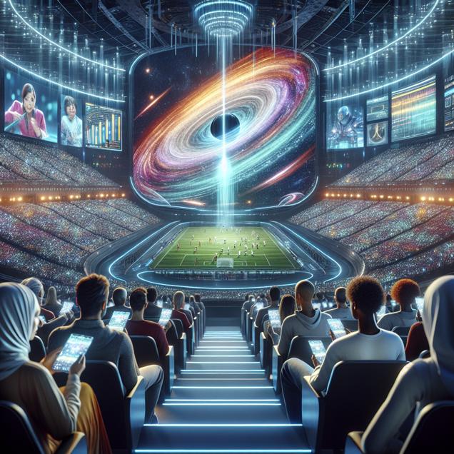 Prompt: An image that looks like it is a scene from 'Star Wars', depicting a big stadium screen displaying the FA Cup final score of a thrilling 3-2 victory, with the winning goal making the difference in the final moments. In the background, a group of fans can be seen on their phones, eagerly searching for the first-ever black hole photo, as the cosmic curiosity sparked by the game's intense energy and excitement grips the audience. The depiction should include only scenes, people, and objects, it should not include text or speech bubbles.