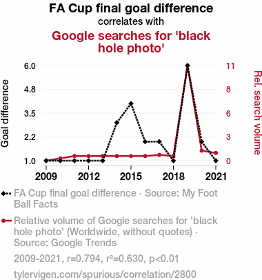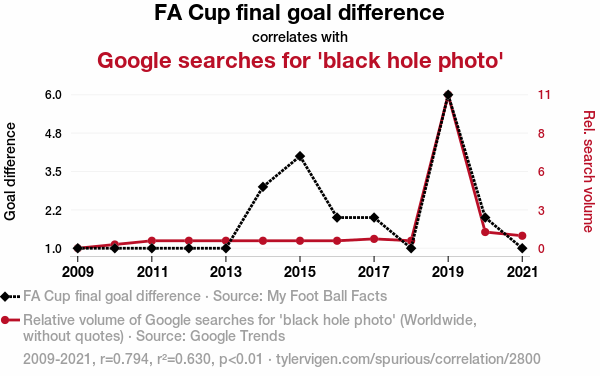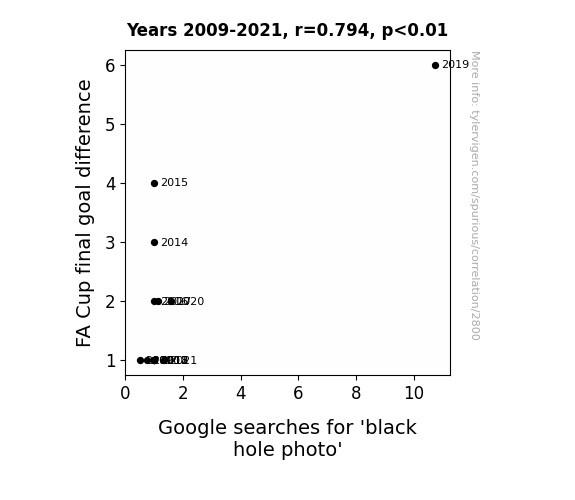 - The spurious research paper: Kicking Off the Event Horizon: Exploring the Goalpost Connection Between FA Cup Final Goal Difference and Google Searches for 'Black Hole Photo'