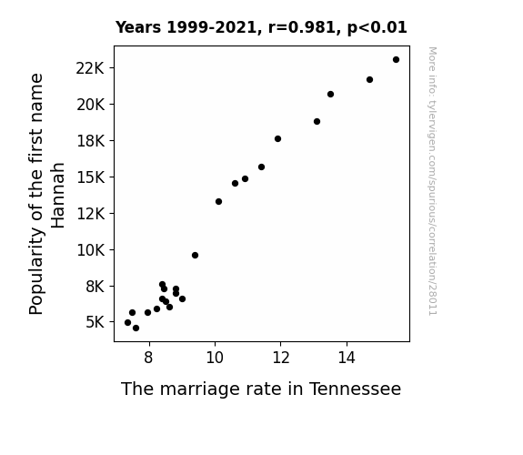 This means 96.2% of the change in the one variable (i.e., The marriage rate in Tennessee) is predictable based on the change in the other (i.e., Popularity of the first name Hannah) over the 23 years from 1999 through 2021.