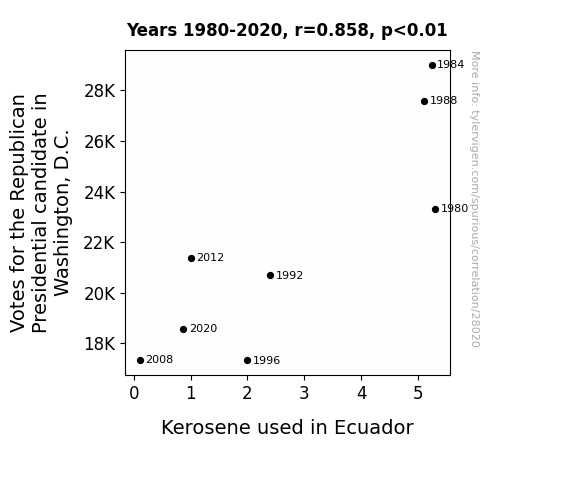 This means 73.6% of the change in the one variable (i.e., Kerosene used in Ecuador) is predictable based on the change in the other (i.e., Votes for the Republican Presidential candidate in Washington, D.C.) over the 8 years from 1980 through 2020.