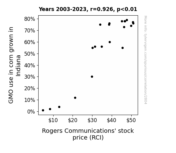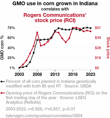 - The spurious research paper: Cross-Pollinating Stock Market Trends: The Corny Connection Between GMO Usage in Indiana and RCI Stock Price