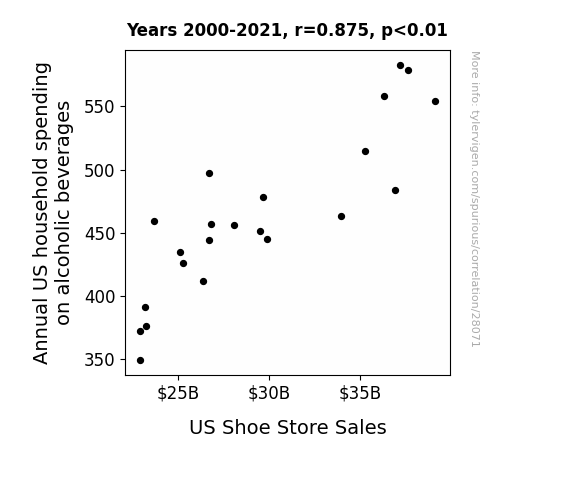 This means 76.5% of the change in the one variable (i.e., US Shoe Store Sales) is predictable based on the change in the other (i.e., Annual US household spending on alcoholic beverages) over the 22 years from 2000 through 2021.