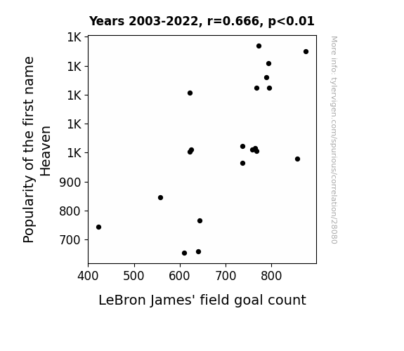 This means 44.3% of the change in the one variable (i.e., LeBron James' field goal count) is predictable based on the change in the other (i.e., Popularity of the first name Heaven) over the 20 years from 2003 through 2022.