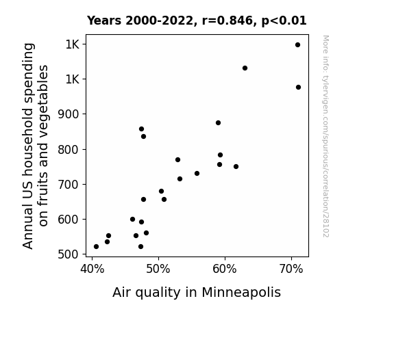 This means 71.6% of the change in the one variable (i.e., Air quality in Minneapolis) is predictable based on the change in the other (i.e., Annual US household spending on fruits and vegetables) over the 23 years from 2000 through 2022.
