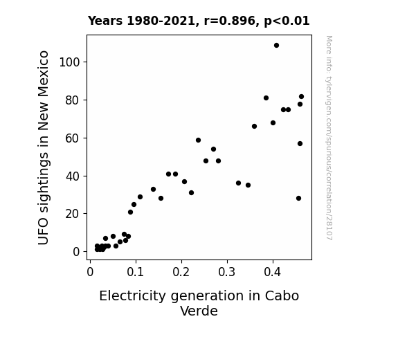 This means 80.3% of the change in the one variable (i.e., Electricity generation in Cabo Verde) is predictable based on the change in the other (i.e., UFO sightings in New Mexico) over the 42 years from 1980 through 2021.