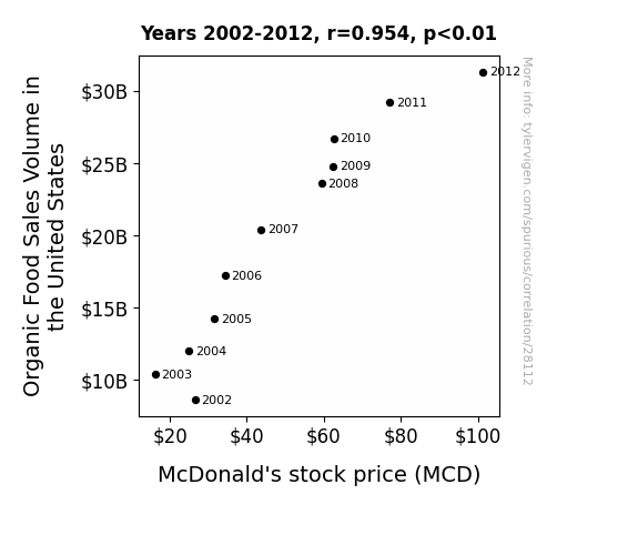 This means 91.1% of the change in the one variable (i.e., McDonald's stock price (MCD)) is predictable based on the change in the other (i.e., Organic Food Sales Volume in the United States) over the 11 years from 2002 through 2012.