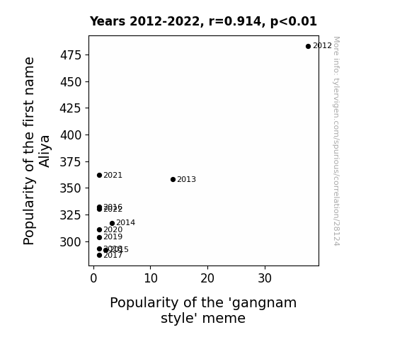 This means 83.5% of the change in the one variable (i.e., Popularity of the 'gangnam style' meme) is predictable based on the change in the other (i.e., Popularity of the first name Aliya) over the 11 years from 2012 through 2022.