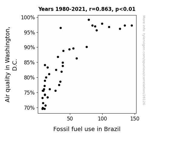 This means 74.4% of the change in the one variable (i.e., Fossil fuel use in Brazil) is predictable based on the change in the other (i.e., Air quality in Washington, D.C.) over the 42 years from 1980 through 2021.