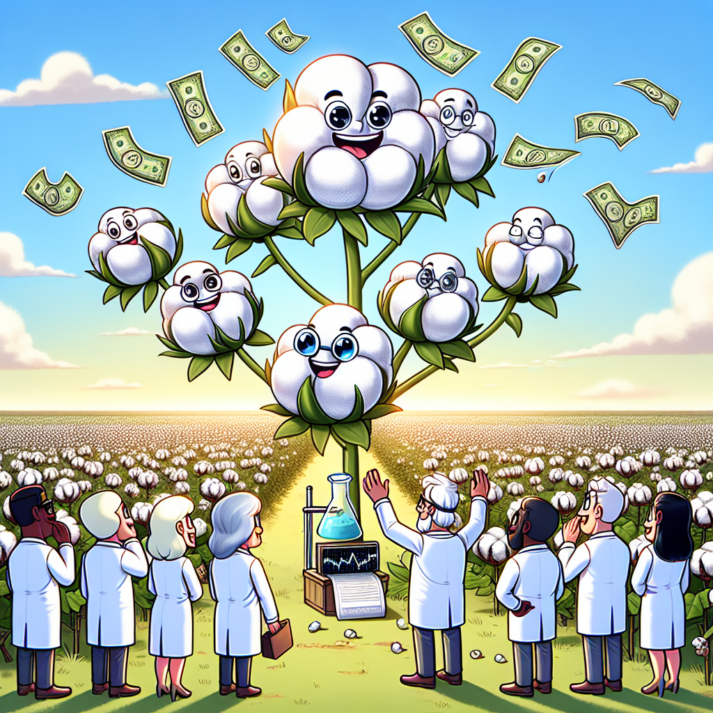 Prompt: [ Cute cartoon ] An adorable group of anthropomorphic cotton plants with smiling faces stand proudly in a vast, sunlit field in Louisiana. Instead of the usual fluffy white fibers, their bolls are bursting with crisp dollar bills. Nearby, a team of cute, wide-eyed scientists in white lab coats looks on in amazement. Meanwhile, a digital stock ticker displays The Bank of Nova Scotia's (BNS) stock price, showing a steady rise as the cotton cash floods the market. The depiction should include only scenes, people, and objects, it should not include text or speech bubbles.