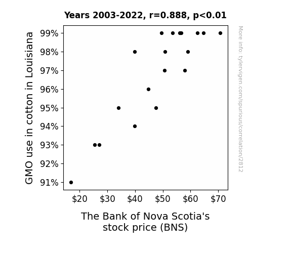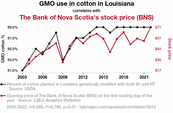 This means 78.8% of the change in the one variable (i.e., The Bank of Nova Scotia's stock price (BNS)) is predictable based on the change in the other (i.e., GMO use in cotton in Louisiana) over the 20 years from 2003 through 2022.