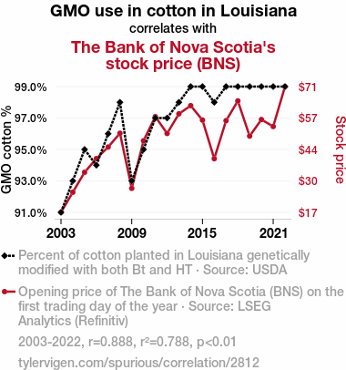 As the old saying goes, "when life gives you cotton, make connections – even if they seem a bit 'tangential' at first glance." In line with this adage, our curiosity was piqued by the unexpected interplay between the use of genetically modified organisms (GMOs) in cotton production in Louisiana and the stock price of The Bank of Nova Scotia (BNS). This unorthodox pairing led us on a statistical escapade to untangle the threads of this seedy business – pun intended.