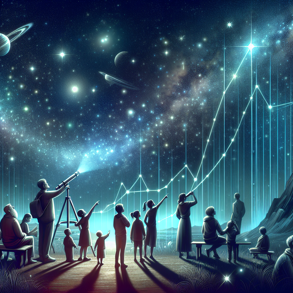 Prompt: [ Concept art ] Create an enchanting depiction of a serene night sky, brimming with an array of twinkling stars. Families are gathered, captivated by the celestial spectacle as they peer through telescopes. Amidst the awe-inspired onlookers, children named Skylar point with wide-eyed excitement at the cosmic wonders above. Meanwhile, a few figures check their phones, where the stock price of Cardinal Health is soaring to new heights. The depiction should include only scenes, people, and objects, it should not include text or speech bubbles.