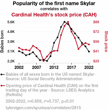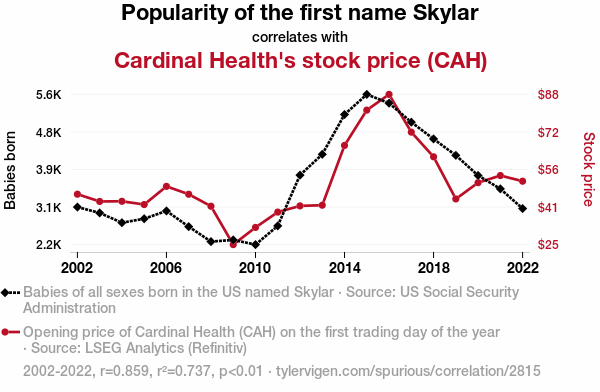 Skylar popularity, stock price correlation, baby names impact on stock prices, Skylar name trend, Cardinal Health stock analysis, US Social Security Administration data, LSEG Analytics, Skylar name statistics, stock performance correlation, unconventional factors in stock performance, Skylar name impact on financial success