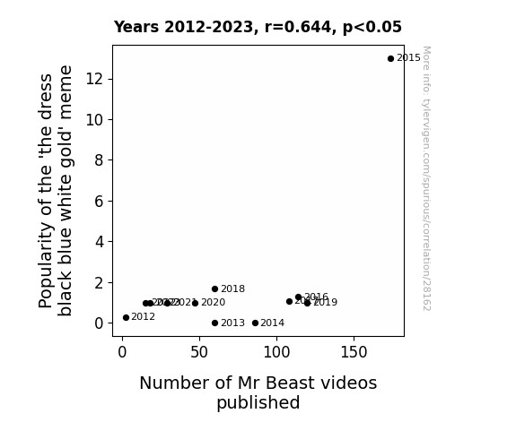 This means 41.5% of the change in the one variable (i.e., Number of Mr Beast videos published) is predictable based on the change in the other (i.e., Popularity of the 'the dress black blue white gold' meme) over the 12 years from 2012 through 2023.
