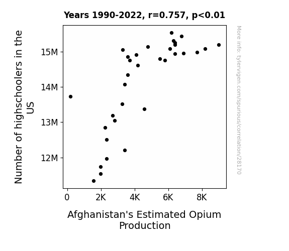 This means 57.3% of the change in the one variable (i.e., Afghanistan's Estimated Opium Production) is predictable based on the change in the other (i.e., Number of highschoolers in the US) over the 33 years from 1990 through 2022.