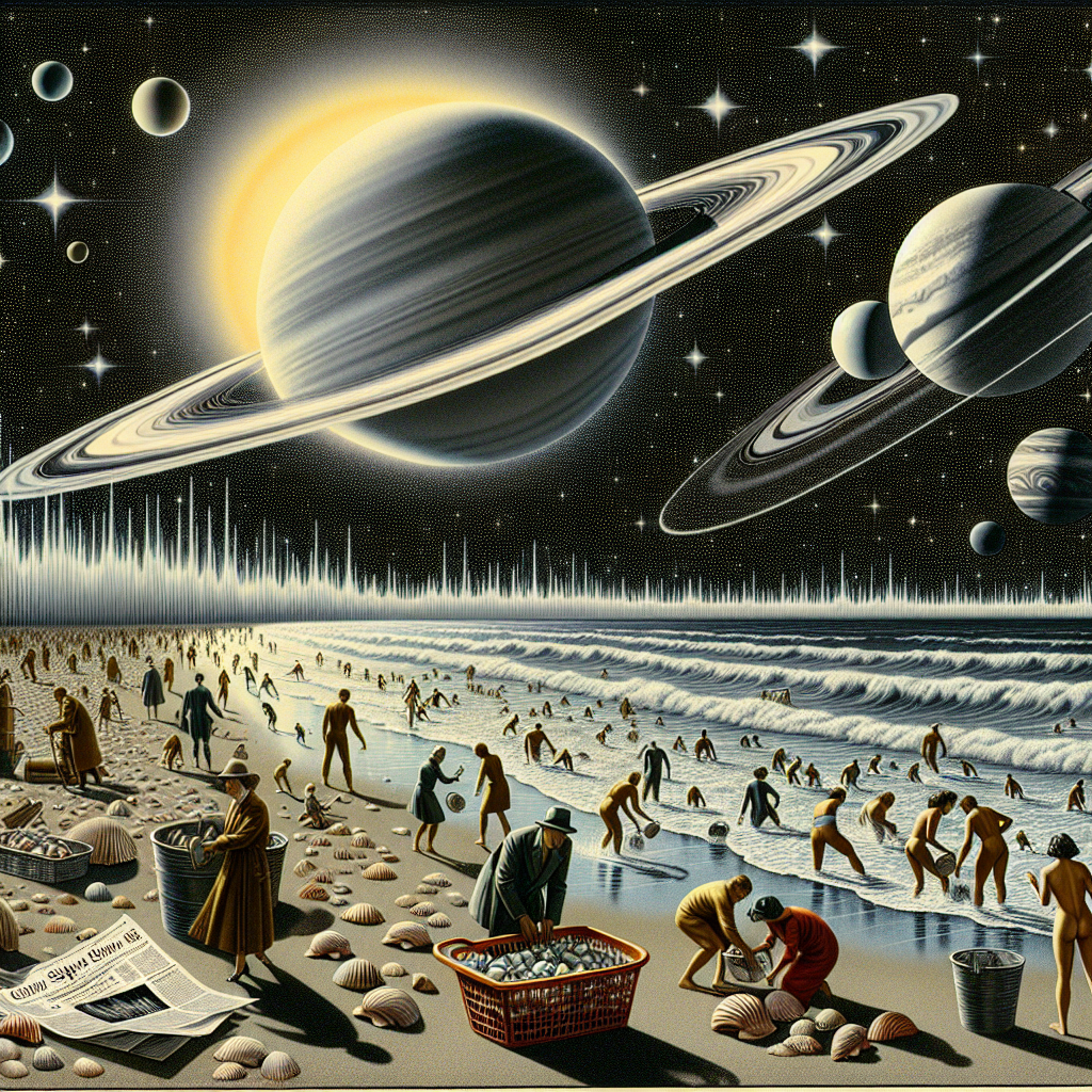 Prompt: Generate an image showing a breathtaking cosmic landscape, with Saturn and Jupiter in the background, slowly drifting apart in the starry expanse. In the foreground, depict a serene beach where a noticeable decrease in shell quantities is evident, subtly hinting at the gravitational shift. Show a sense of urgency and demand as people are seen searching for and collecting the limited supply of shells. Additionally, allude to the financial impact by subtly portraying a stock market ticker displaying the rising value of "SHEL" stock. Enhance the depth and detail of the cosmic and beach elements to create an immersive visual experience. The depiction should include only scenes, people, and objects, it should not include text or speech bubbles.