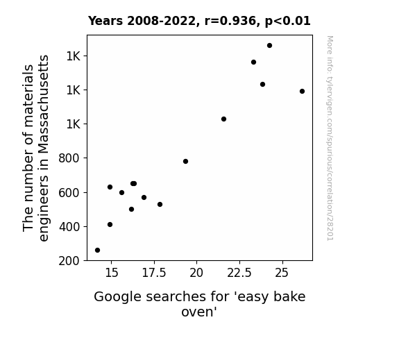 This means 87.6% of the change in the one variable (i.e., Google searches for 'easy bake oven') is predictable based on the change in the other (i.e., The number of materials engineers in Massachusetts) over the 15 years from 2008 through 2022.